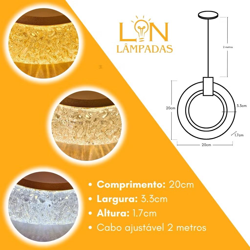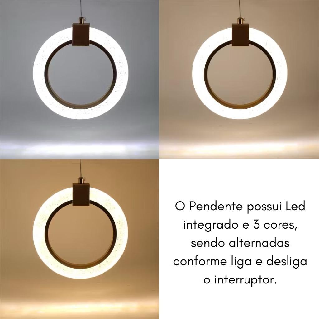 PENDENTE ANEL DOURADO DE CRISTAL REDONDO 3COR DE LED